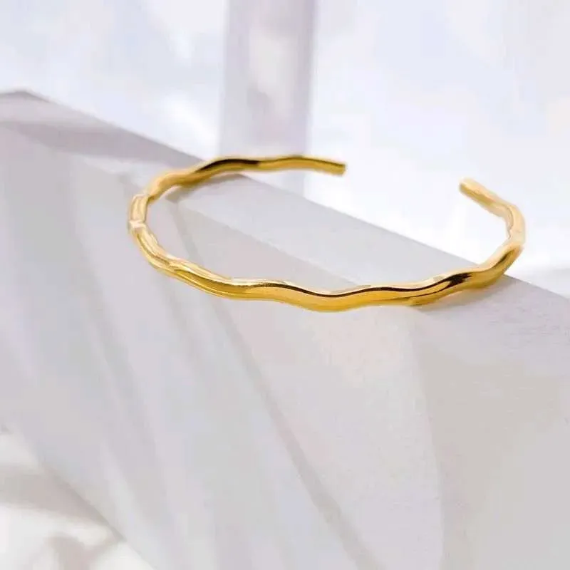 Este diseño único, inspirado en la suavidad de las ondas naturales, envuelve tu muñeca con un toque de sofisticación y modernidad. Perfecto para cualquier ocasión, este brazalete no solo resalta tu estilo, sino que también refleja tu esencia libre y audaz. Elaborado en acero titanio enchapado en oro...